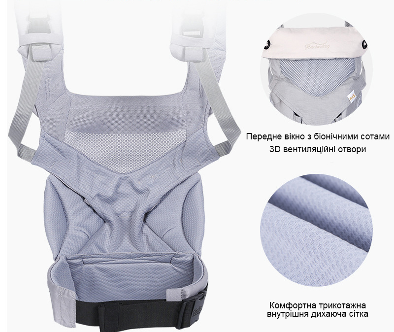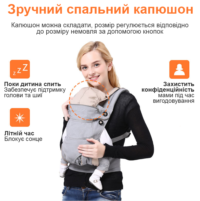 На рюкзаку є спеціальний капюшон, який підтримує голову дитини під час сну, захищає від сонця влітку і дозволяє годувати малюка під час прогулянок.