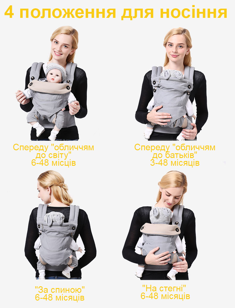 - Можна носити малюка у чотирьох позиціях, без придбання додаткової вкладки для новонароджених.