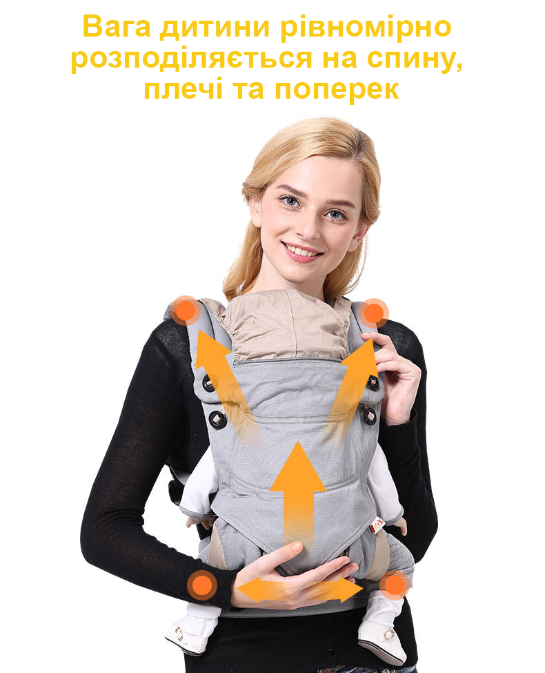 Широкий пояс і м'які, зручні лямки спеціально для того, щоб батько не втомлювався під час тривалого перенесення малюка. Це дозволяє рівномірно розподіляти вагу дитини по тілу батьків.