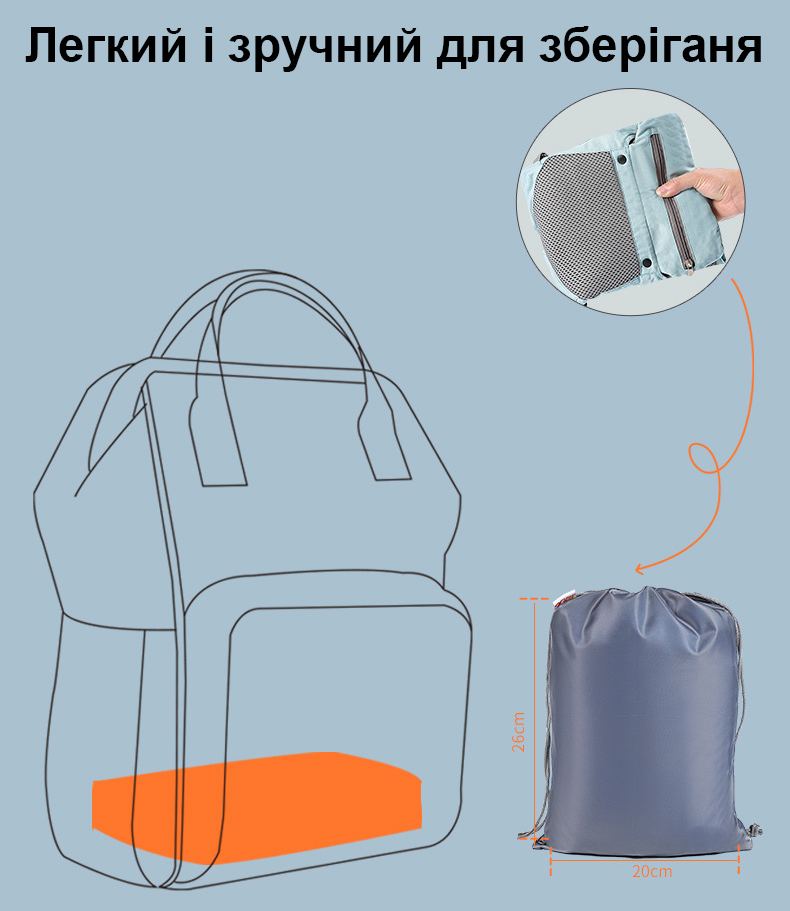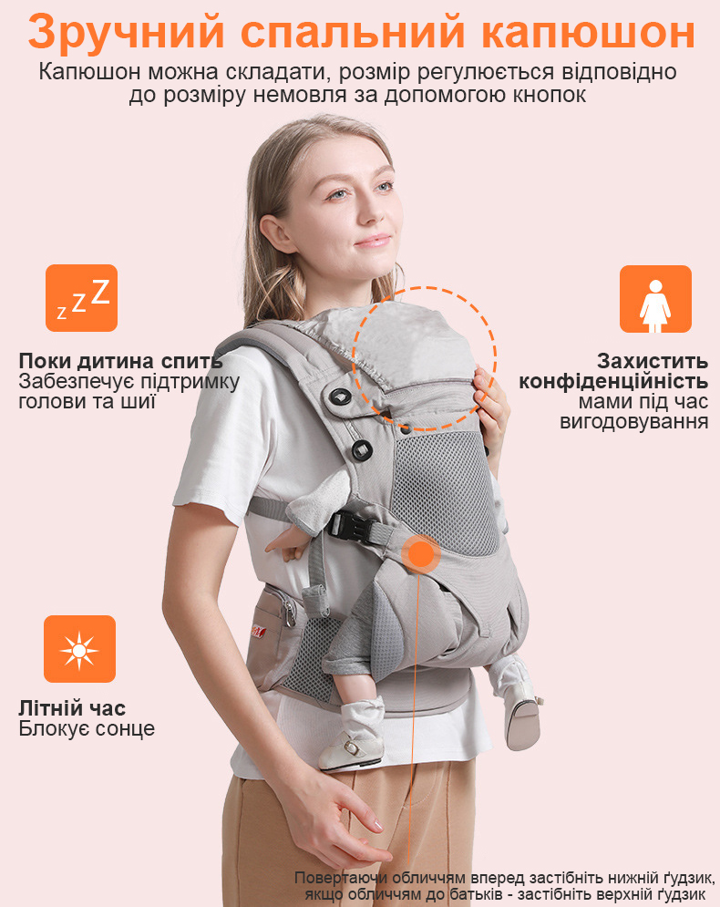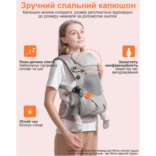 На рюкзаку є спеціальний капюшон, який підтримує голову дитини під час сну, захищає від сонця влітку і дозволяє годувати малюка під час прогулянок.