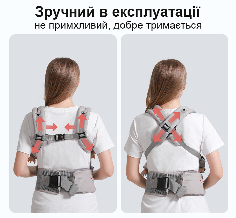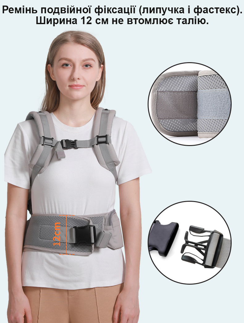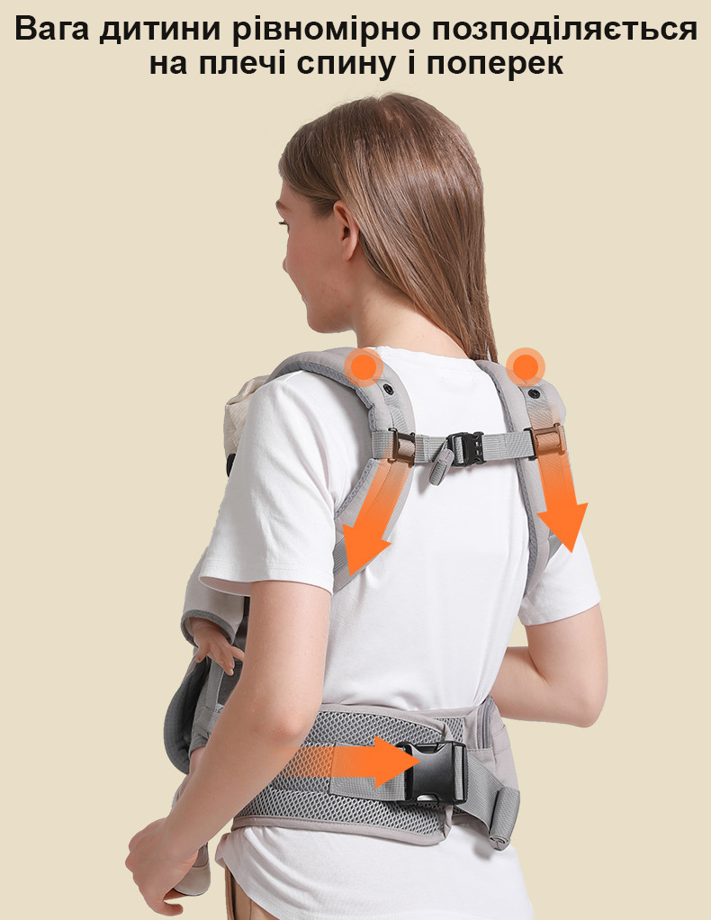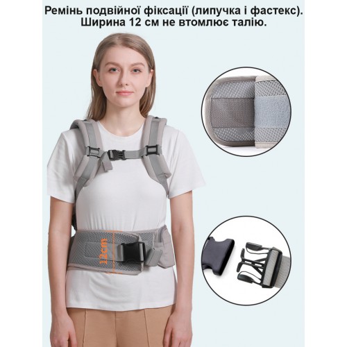 Широкий пояс і м'які, зручні лямки спеціально для того, щоб батьки не втомлювався під час тривалого перенесення малюка. Це дозволяє рівномірно розподіляти вагу дитини по тілу батьків.